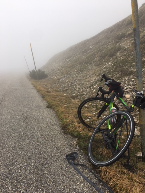 Fisicamente sto molto bene ma dopo i 1500mt di altitudine, ora che anche la notte scende, con nebbia fitta, vento fortissimo, pioggia e neve ,,, questo everesting sta diventando qualcosa di epico.